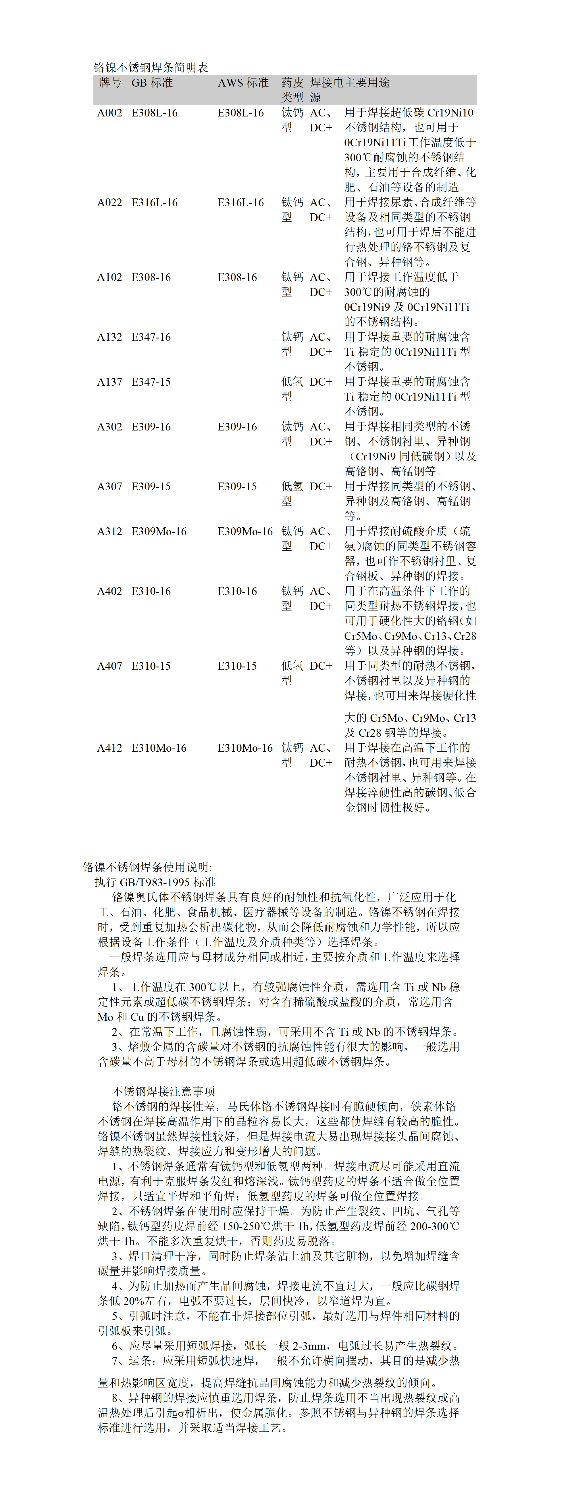 铬镍不锈钢焊条简明表 牌号 GB 标准 AWS 标准 药皮类型 焊接电源 主要用途 A002 E308L-16 E308L-16 钛钙型 AC 、 DC+ 用于焊接超低碳 Cr19Ni10 不锈钢结构,也可用于 0Cr19Ni11Ti 工作温度低于 300 ℃...